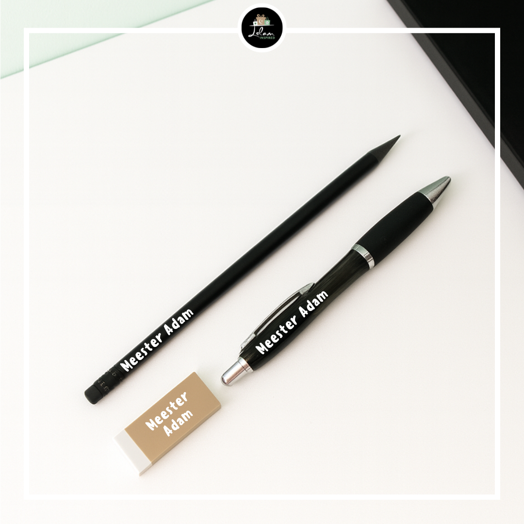 With or without a personalized writing set consisting of a personalized pencil, ballpoint pen and eraser.