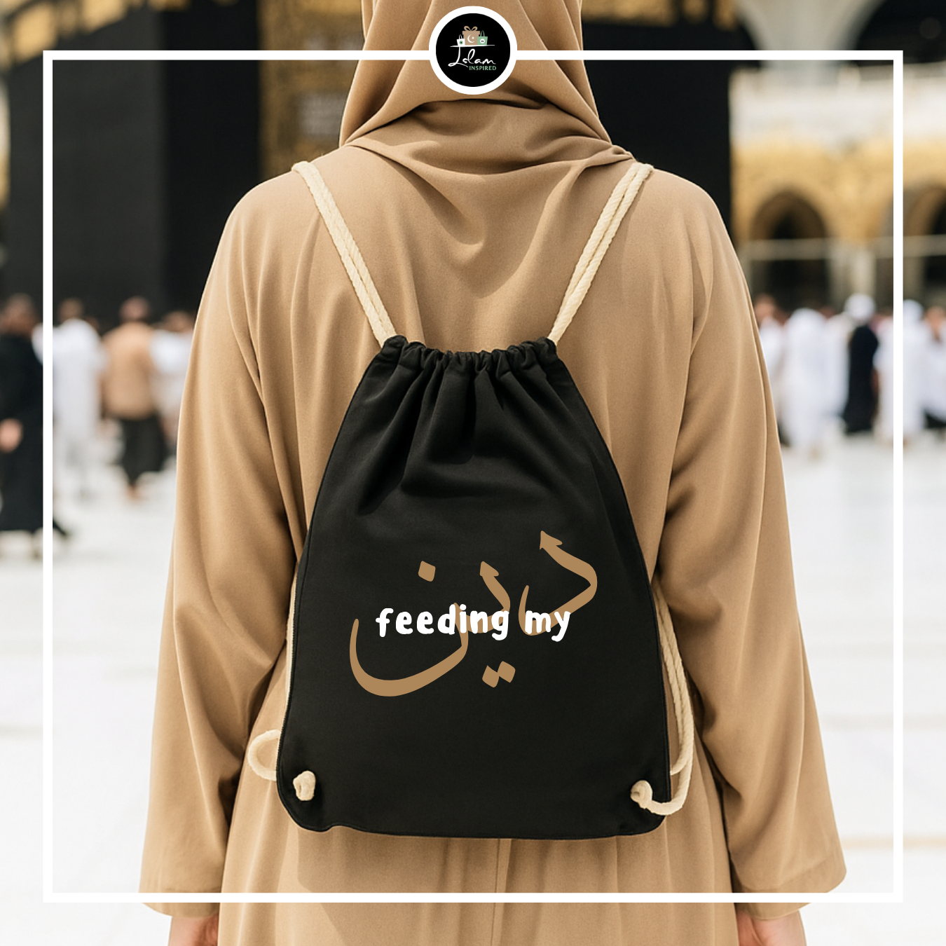 Zwarte katoenen trekkoord tas (38x42cm), met vinyl bedrukt. Ideaal om Umrah of Hajj essentials in te bewaren tijdens de bedevaart en moskee bezoeken. Of gewoon om naar de les te gaan. Daarnaast is het ook handig om schoenen in te bewaren.