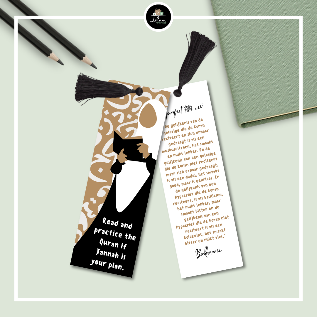 Deze gepersonaliseerde boekenlegger is 14x5cm groot, gelamineerd, voorzien van een tassel en langs beide kanten bedrukt. Op de achterkant bevindt zich een prachtige hadith over het belang van de Quran lezen en praktiseren.