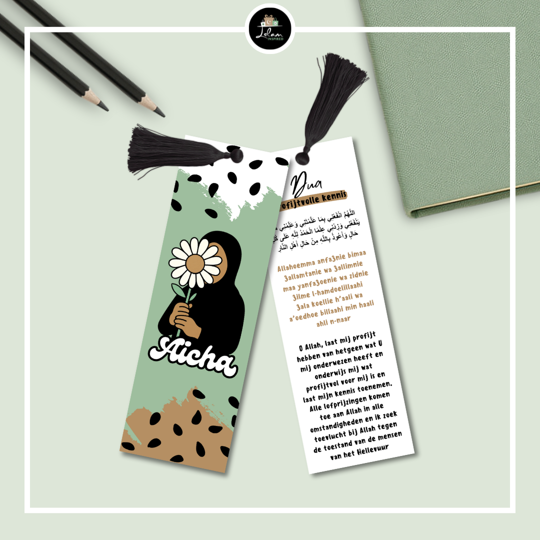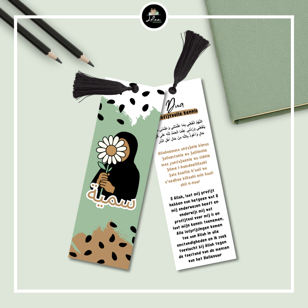 Dubbelzijdige en gepersonaliseerde boekenlegger voor een jonge moslima