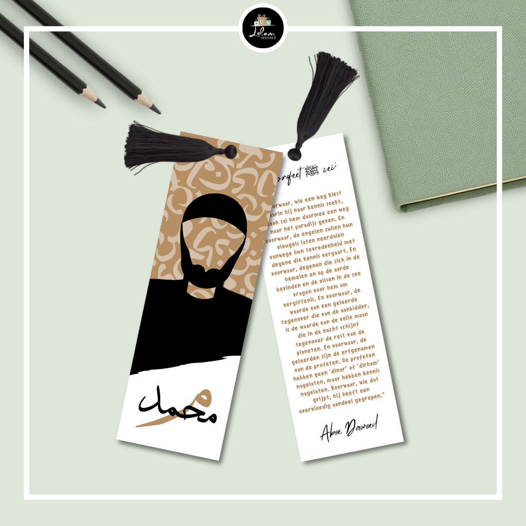 Deze gepersonaliseerde boekenlegger is 14x5cm groot, gelamineerd, voorzien van een tassel en langs beide kanten bedrukt. Op de achterkant bevindt zich een prachtige hadith over het belang en de beloning van kennis opdoen.