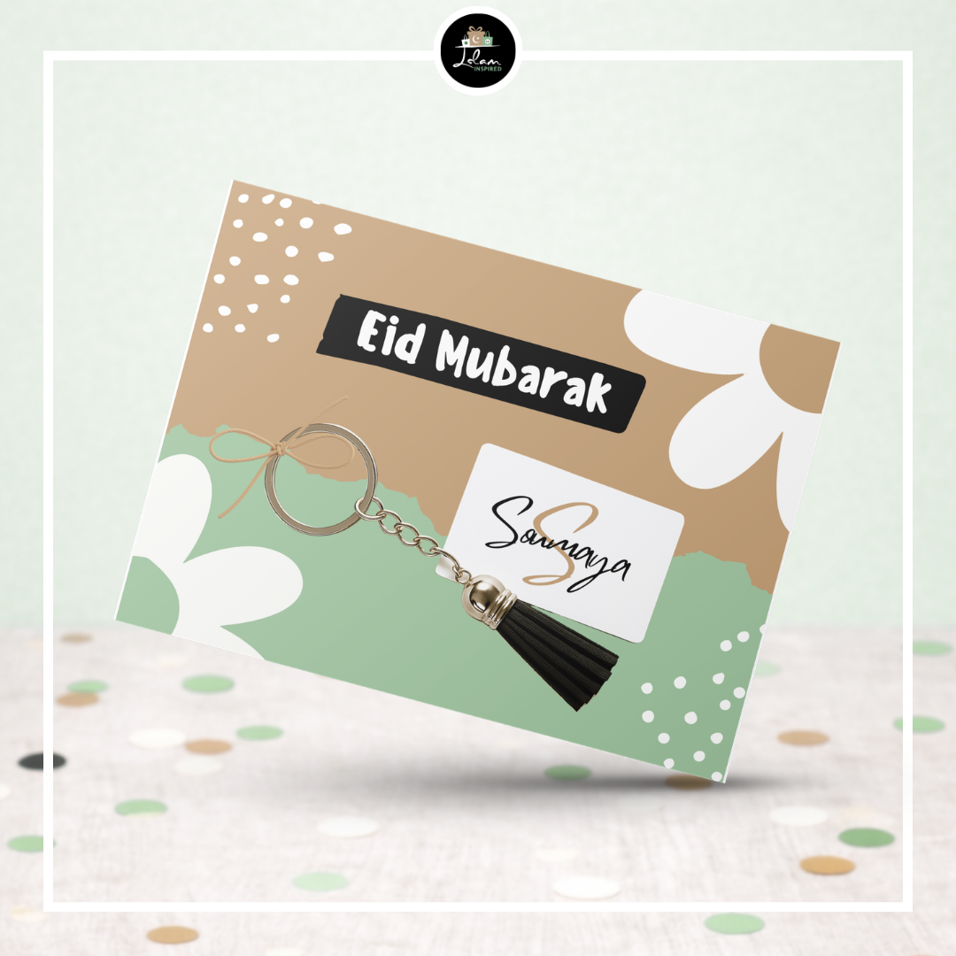 Eid Mubarak keycard van 12x16cm met een gepersonaliseerde sleutelhanger. Gedrukt op stevig fotopapier. Wordt geleverd in een doorzichtige folie.