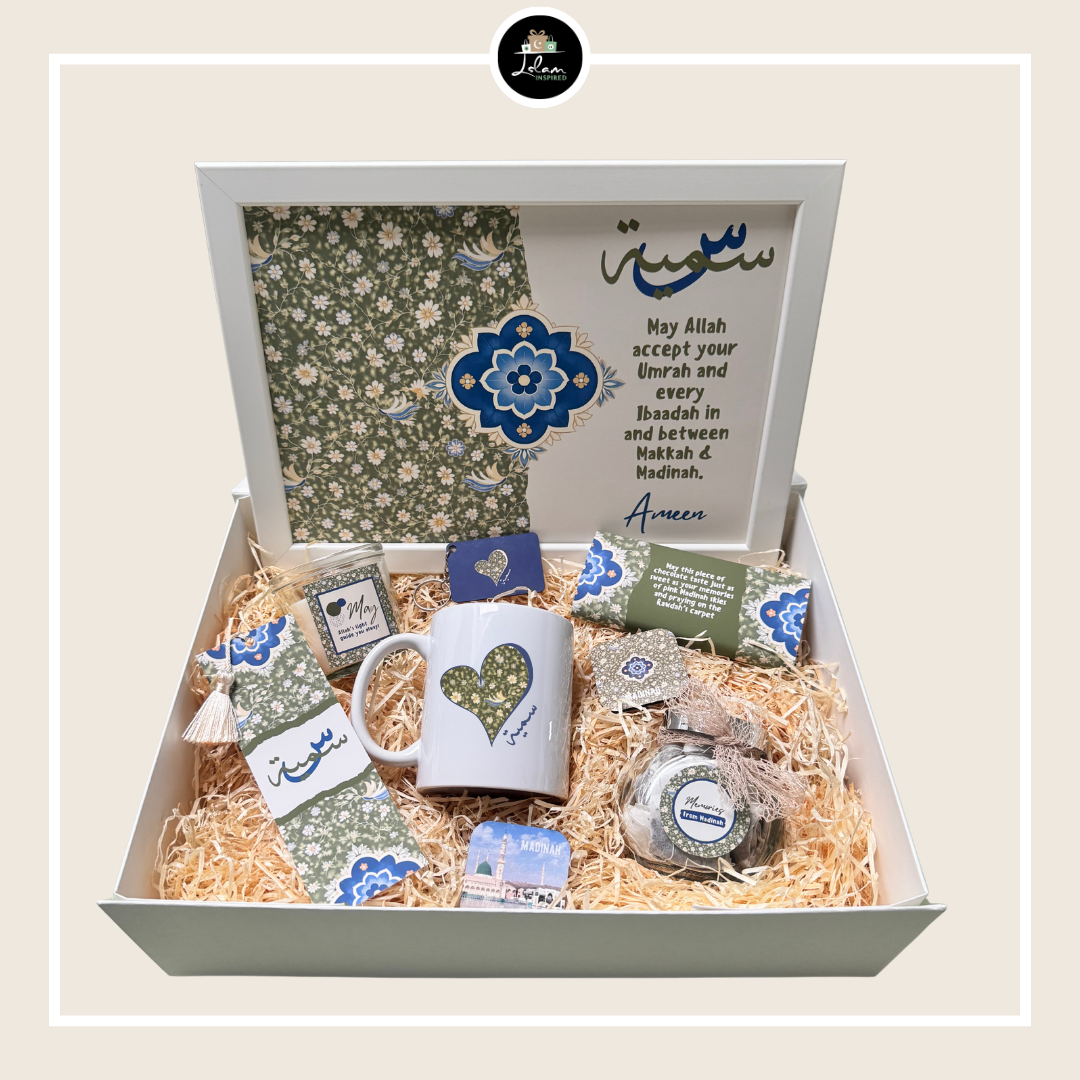 Een giftbox voor een Hajj of Umrahganger die zijn of haar hart is verloren in Madinah. Het design is geïnspireerd op de bekende groene tapijten in Masdjid an Nabawi.