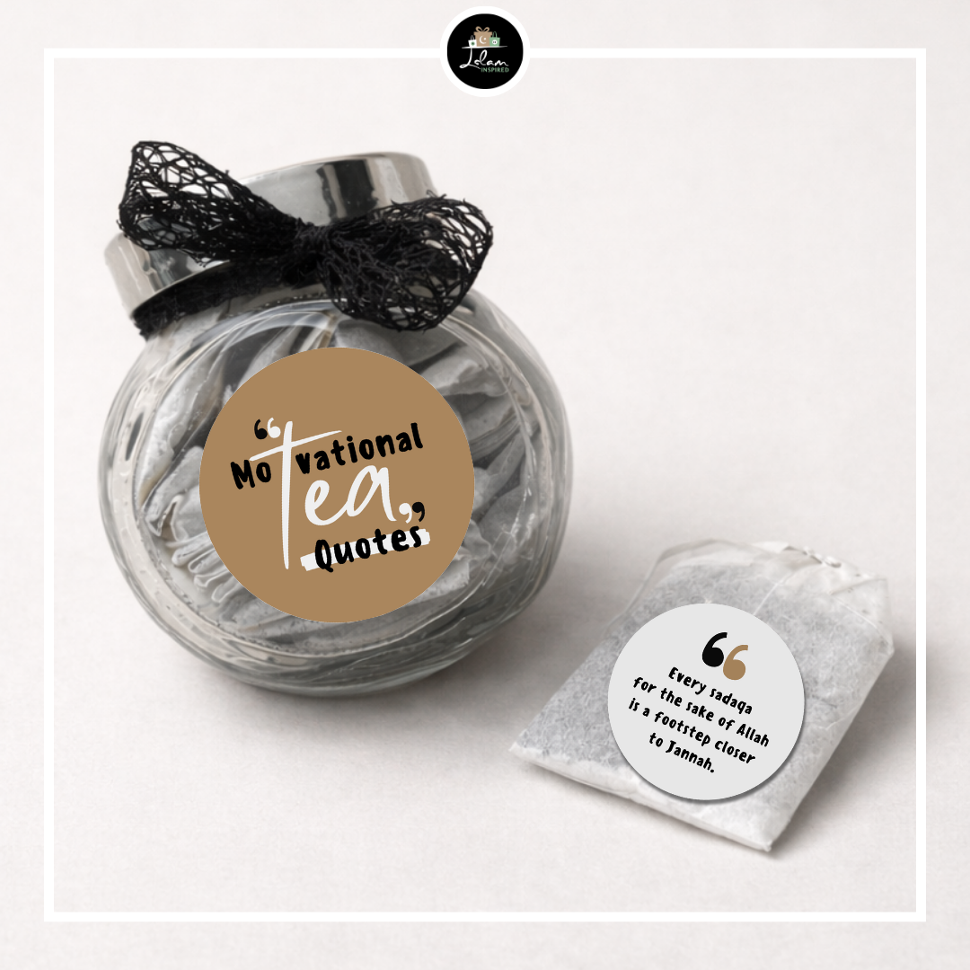 10 theezakjes voorzien van evenveel motiverende quotes (Engelstalig). Steeds vanuit een Islamitische invalshoek. Wij gebruiken bewust geen theezakjes van pro-Israëlische merken.