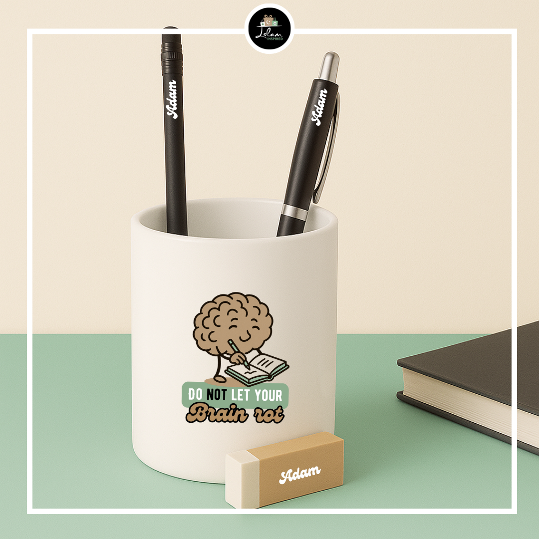 Deze Gen Z & Gen Alpha pennenhouder herinnert een puber of tiener eraan in hun eigen taal dat ze hun brein niet mogen laten rotten.