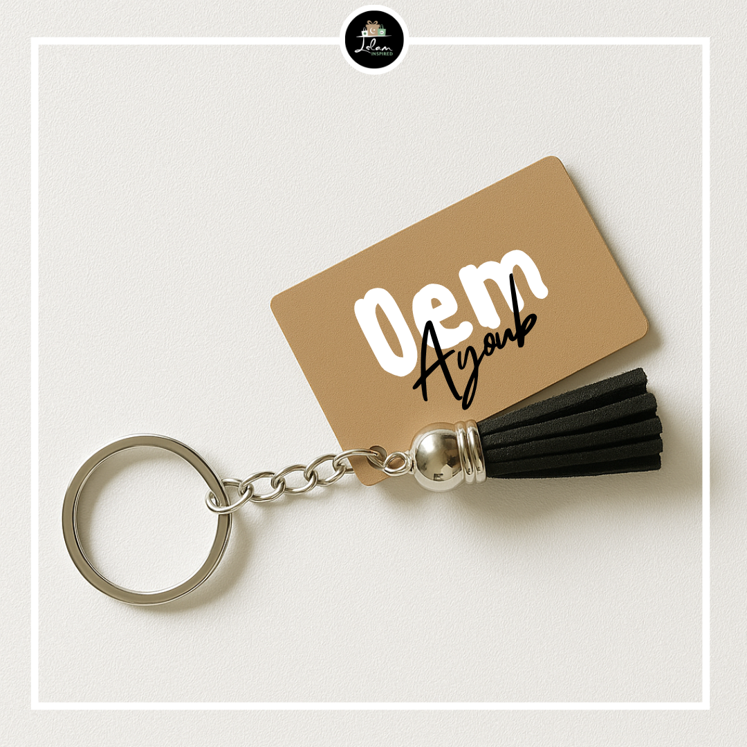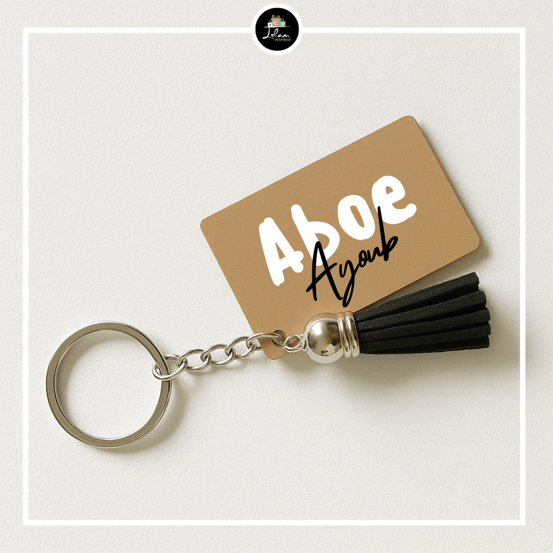 Sleutelhanger (6x4cm) met Kunya = naam van vader (Aboe) of moeder (Oem) + naam van het eerstgeboren kind.